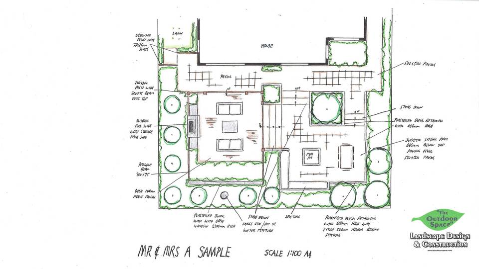 The Process - we will send you a landscape questionaire to fill in that asks details of what you would like or dislike in your design, your thoughts and vision, and any plans you can supply us. We then will meet onsite to discuss further and take any measurements required. We take all this information to our office where a to scale colour hand drawn landscape plan is drawn up for you with all the information on it including plants if this is required. A copy will be sent to you to look over and make any changes if required and perhaps another meeting to discuss, if needed we will then make any changes and get a copy of the plans to you. At this point we are happy to provide a free quote to construct your new outdoor space.